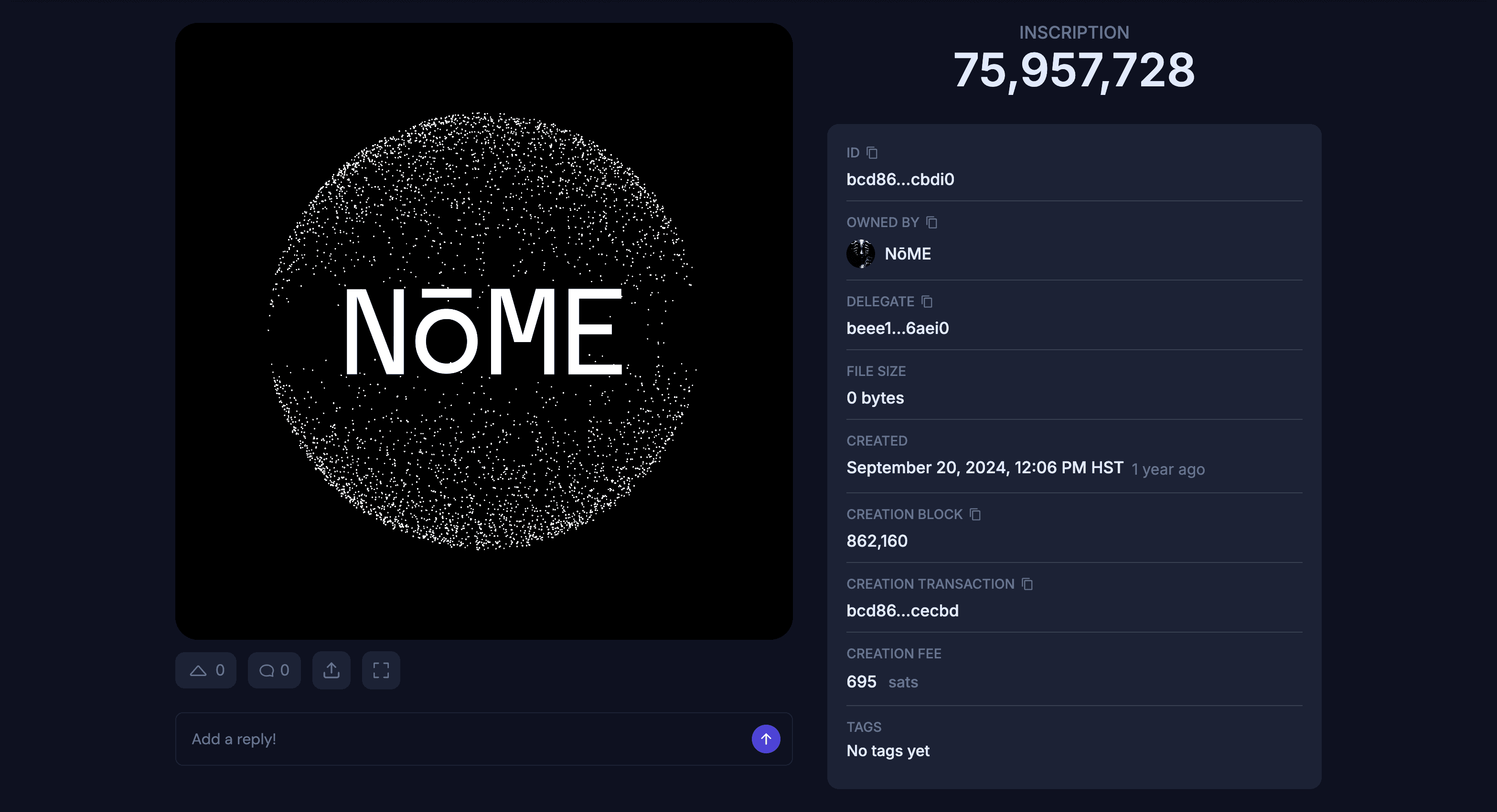 Globe marks my first exploration of generative art with p5.js, allowing me to create pieces that are both dynamic and sustainable. By using code instead of traditional image files, I could inscribe the artwork directly on Bitcoin in a cost-effective way. The piece reflects the concept of eternity and global connection, symbolizing the ongoing adoption of blockchain technology and becoming a cornerstone of the NōME brand.