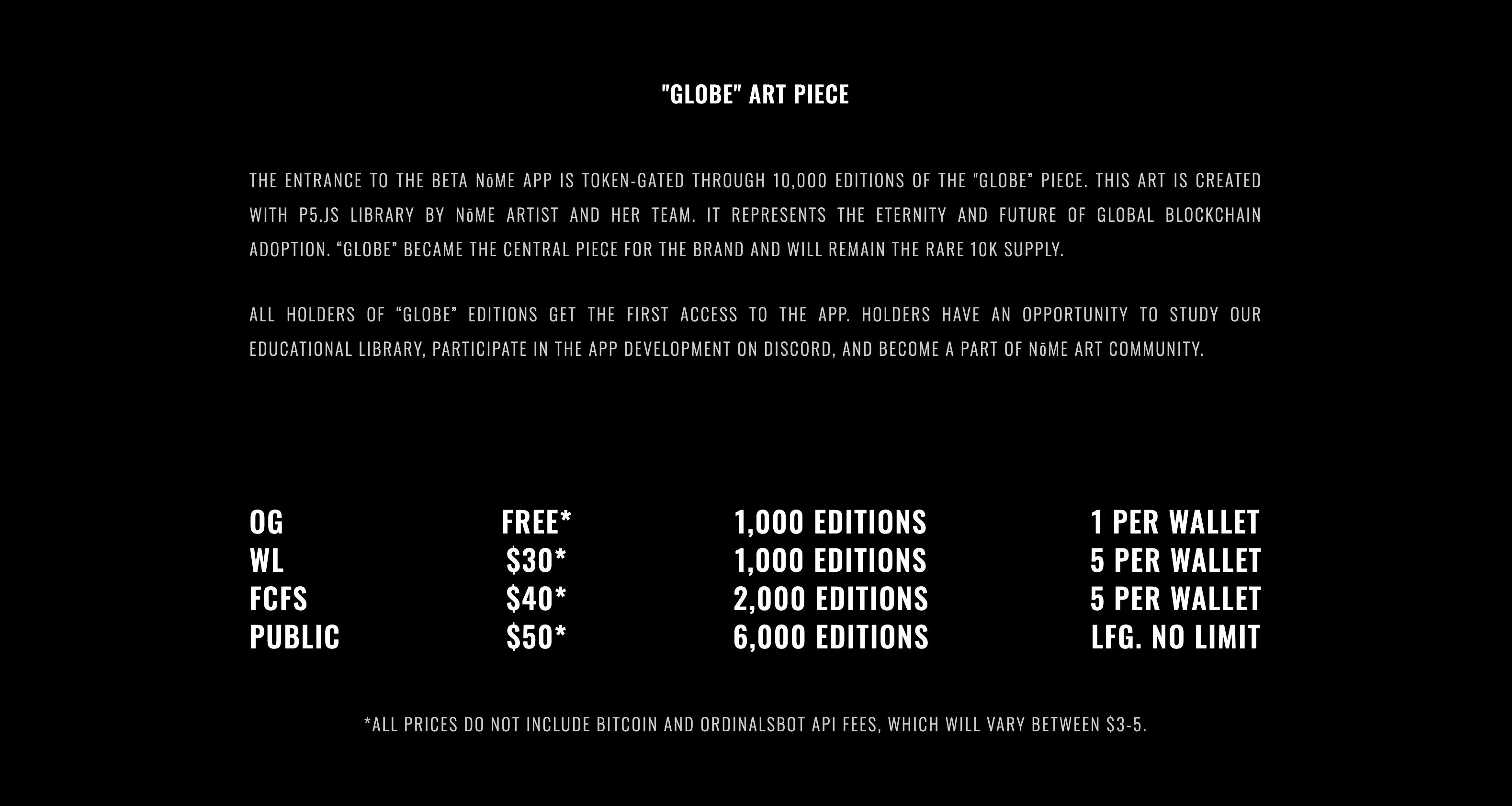 Globe is the first piece I created using the p5.js library, exploring code-based art as a sustainable way to create on Bitcoin. It represents the future of global blockchain adoption while becoming a rare, central piece of the NōME brand.