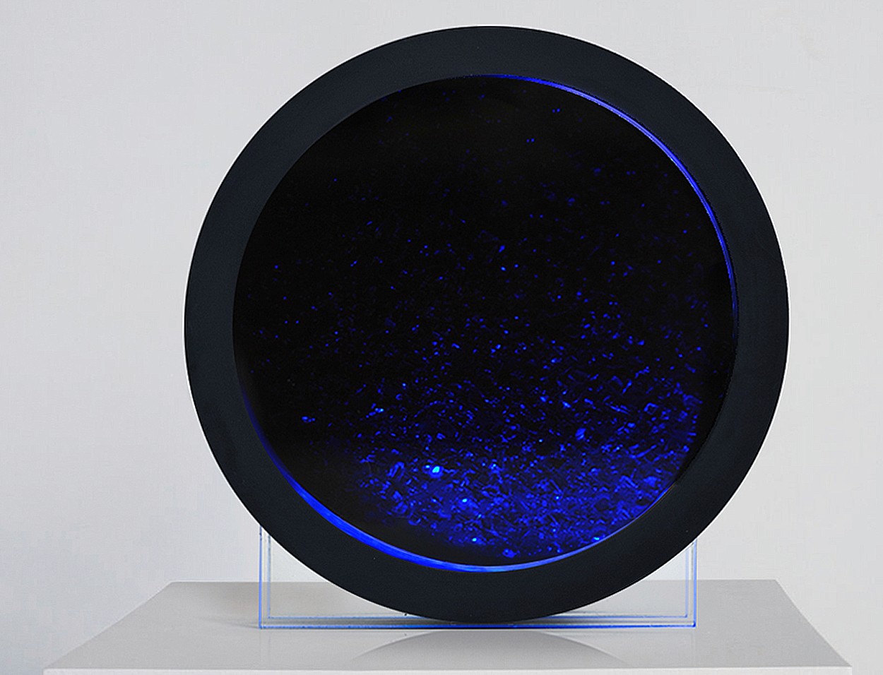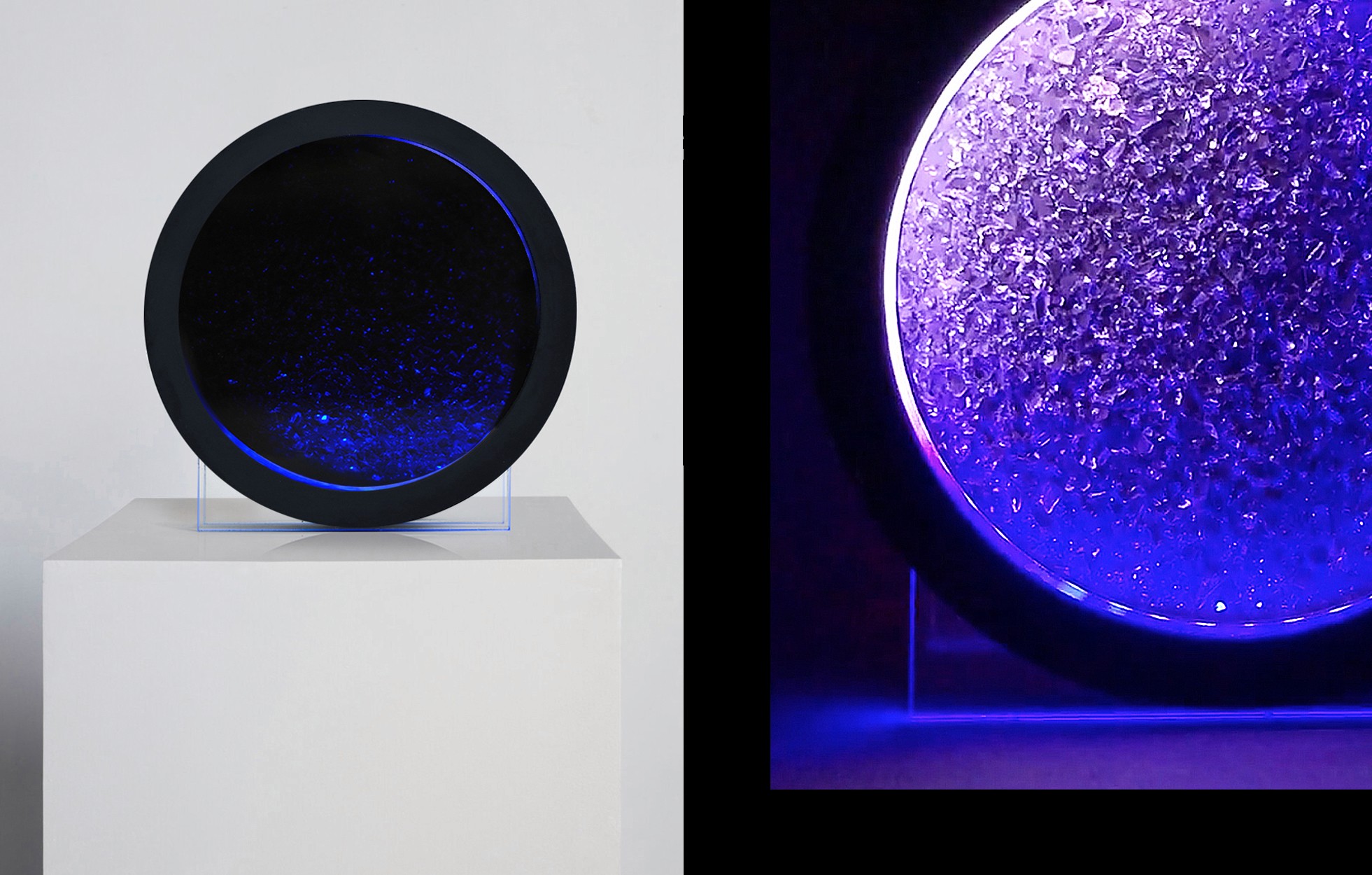 The one way mirror is reflective on one side and transparent on the other. This effect occurs when one side is brightly lit while the other remains dark. When illuminated, fragments of broken glass catch and scatter the light, creating a dynamic, layered reflection.